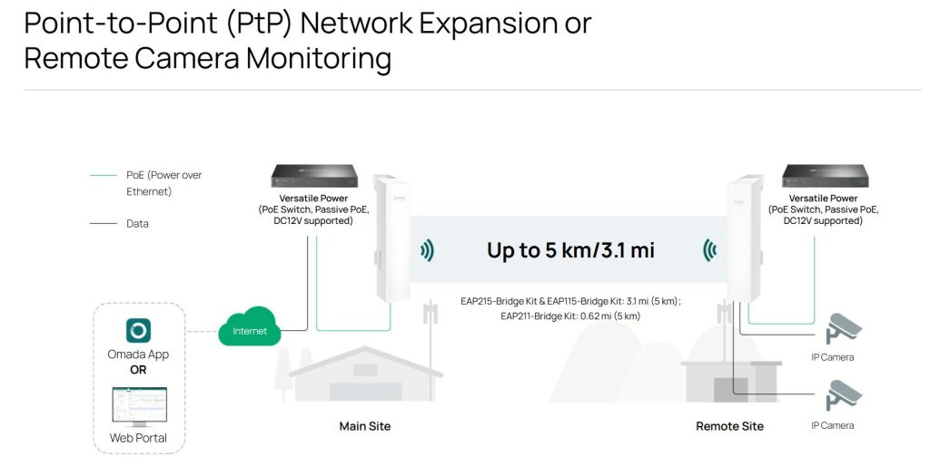- Thiết bị chuyên dụng: Sử dụng các bộ KIT như EAP215-Bridge KIT (5GHz, 867Mbps, 5km), EAP211-Bridge KIT (1km) hoặc các AP Omada Outdoor.